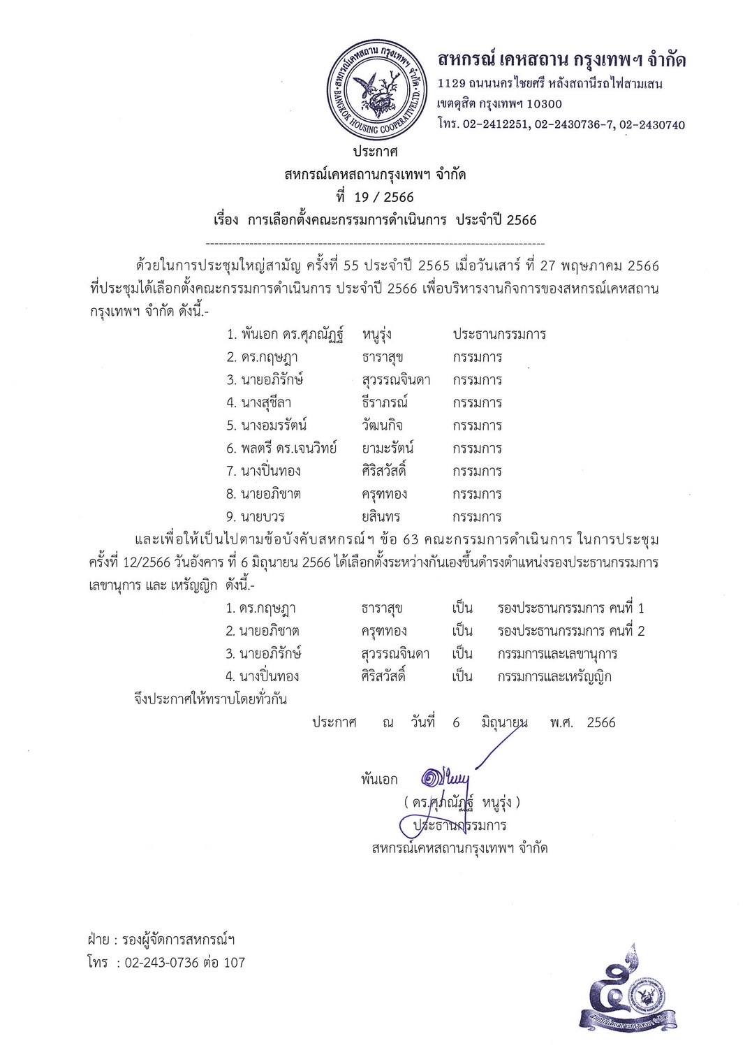 ประกาศ ที่ 12-2566 เรื่อง ประกาศราชื่อผู้มีสิทธิ์รับเลือกตั้งเป็นผู้ตรวจสอบกิจการ ประจำปี 2566 ของสหกรณ์เคหสถานกรุงเทพฯ จำกัด
