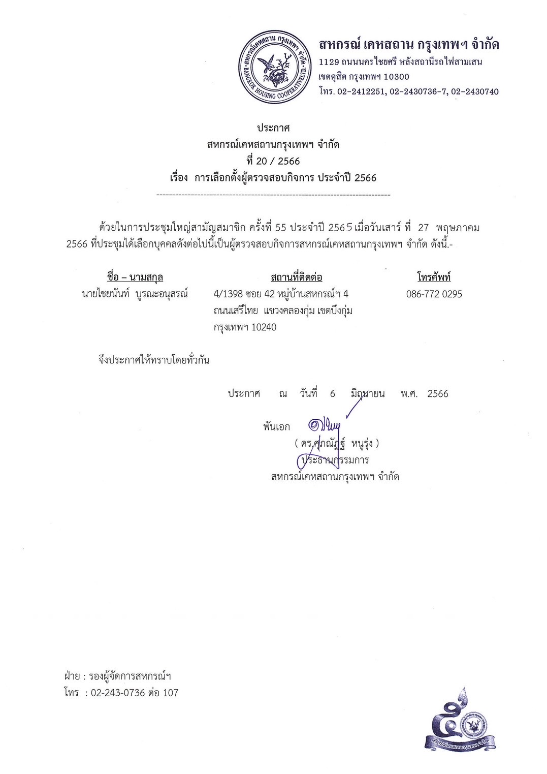 ตามที่มีการประชุมใหญ่สามัญ ประจำปี 2565 เมื่อวันเสาร์ที่ 27 พฤษภาคม 2566 ได้เลือก นายไชยนันท์ บูรณะอนุสรณ์ เป็นผู้ตรวจสอบกิจการของสหกรณ์เคหสถานกรุงเทพฯ จำกัด นั้น การประชุมคณะกรรมการดำเนินการ ครั้งที่ 12/2566 วันอังคารที่ 6 มิถุนายน 2565 ได้มีมติรับทราบการเลือกผู้ตรวจสอบกิจการของสหกรณ์เคหสถานกรุงเทพฯ จำกัด ประจำปี 2566 ดังนี้ 1. นายไชยนันท์ บูรณะอนุสรณ์ เป็นผู้ตรวจสอบกิจการของสหกรณ์ จำนวน 2 ปี ตามข้อบังคับสหกรณ์ฯ 2. นางสิทธิพร ตันมงคล เป็นผู้ตรวจสอบกิจการ สำรอง