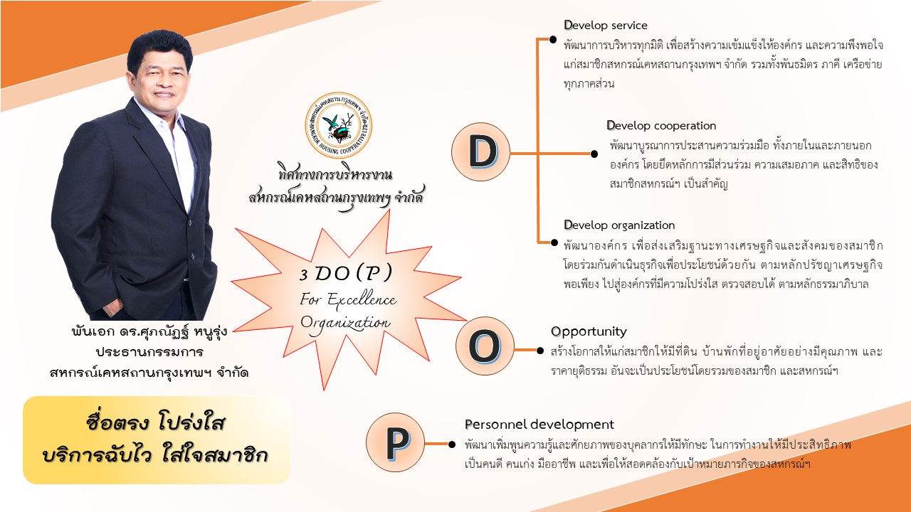 สรุปการประชุมใหญ่สามัญ ประจำปี 2565 ตามที่มีการประชุมใหญ่สามัญ ประจำปี 2565 เมื่อวันเสาร์ที่ 27 พฤษภาคม 2566 ได้เลือกตั้ง พันเอก ดร. ศุภณัฏฐ์ หนูรุ่ง เป็นประธานกรรมการดำเนินการ ของสหกรณ์เคหสถานกรุงเทพฯ จำกัด นั้น การประชุมคณะกรรมการดำเนินการ ครั้งที่ 12/2566 วันอังคารที่ 6 มิถุนายน 2565 ได้มีการเลือกตั้งกรรมการดำเนินการให้ดำรงตำแหน่ง รองประธานกรรมการ เลขานุการ เหรัญญิก ดังนี้ 1. ดร. กฤษฎา ธาราสุข รองประธานกรรมการ คนที่ 1 2. นายอภิชาต ครุฑทอง รองประธานกรรมการ คนที่ 2 3. นายอภิรักษ์ สุวรรณจินดา กรรมการและเลขานุการ 4. นางปิ่นทอง ศิริสวัสดิ์ กรรมการและเหรัญญิก 5. นางสุชีลา ธีราภรณ์ กรรมการ 6. นางอมรรัตน์ วัฒนกิจ กรรมการ 7. พลตรี ดร.เจนวิทย์ ยามะรัตน์ กรรมการ 8. นายบวร ยสินทร กรรมการ